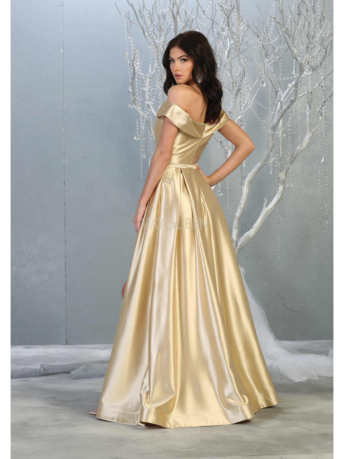 Off the Shoulder Satin A-Line Prom Gown with Pleated Skirt & Leg Slit. Available in Champagne, Dusty Blue, Eggplant and Mauve. Sizes 4-20 Updated: 10-16.