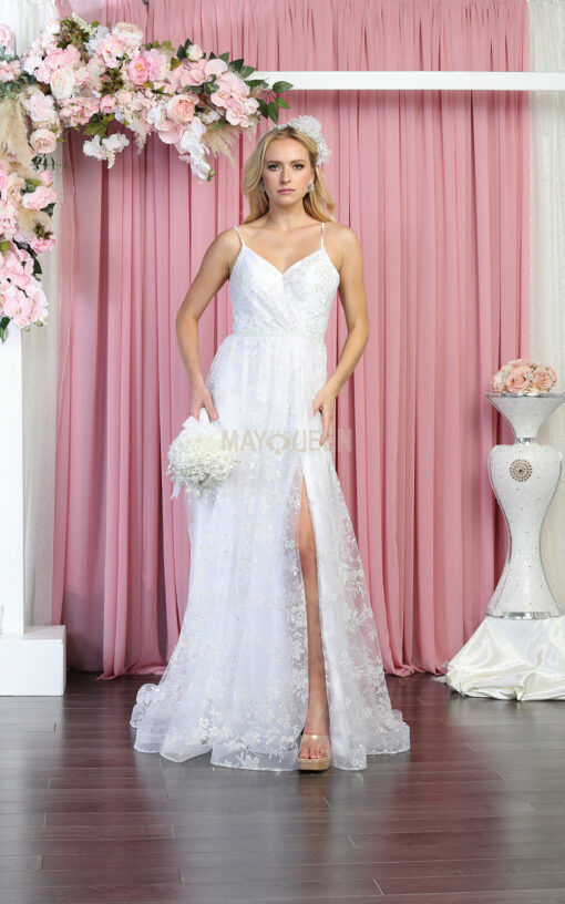 MQ 1787 Glitter Print A-Line Prom Gown with V Neck Open Corset Back & Leg Slit