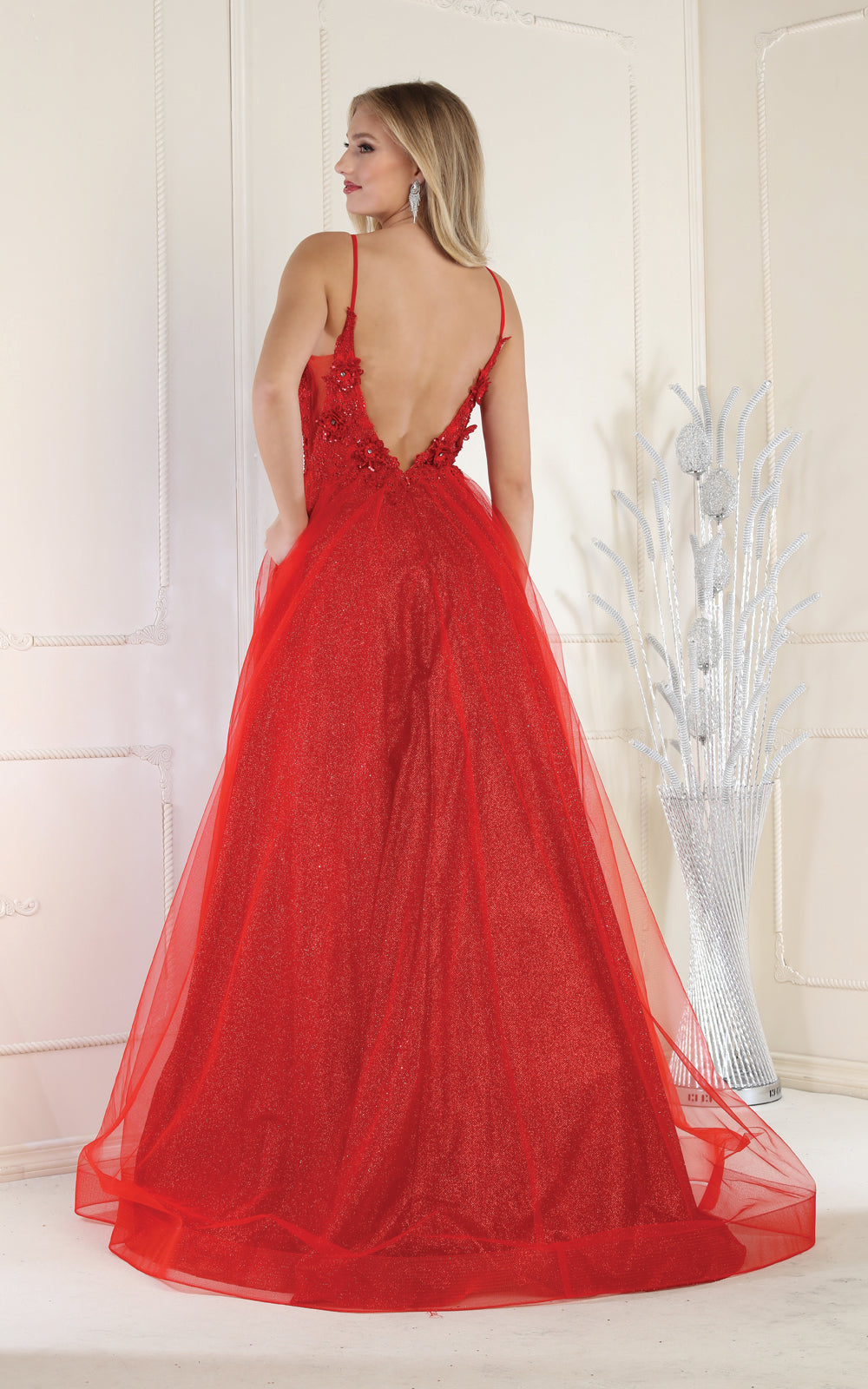 MQ 8024 A-Line Plunging Neckline Prom Gown with 3D Applique Bodice. Available in Dusty Blue.