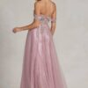 Fit & Flare Off Shoulder Boned Bodice Prom Gown with Leg Slit. Available in Burgundy, Champagne, Dusty Blue, Mauve and Teal Blue. Sizes: 4-20 Updated: 5-10