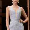 Dazzle on the dance floor with our N C1119 Glitter Print Prom Gown. The sheer corset bodice offers a flattering fit, while the feather adorned skirt adds a touch of whimsy. The glitter print catches the light, making you shine all night. Perfect for prom or a fancy night out.