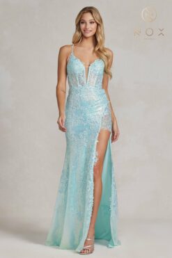 A sheer lace embellished boned bodice and leg slit adds a touch of sultry elegance, while the corset back ensures a perfect fit. Steal the spotlight at prom or any special occasion.