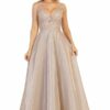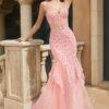 A metallic A-line prom gown with a sheer floral embroidered bodice and an open back, perfect for elegance and daring occasions. Available in Mauve sizes 2-10 and updated 9-8.