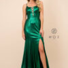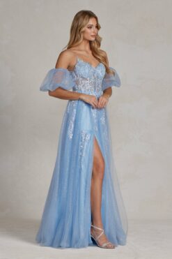 A shimmer tulle prom gown with a sheer beaded lace bodice and removable puff sleeves, featuring a leg slit for easy movement. Available in Blue Sizes: 0-16 Updated: 9-8