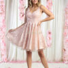 A stunning floral lace embellished A-line prom gown with a plunging V-neckline and spaghetti straps. Features a timeless, elegant look with a flattering silhouette and a daring design that adds a touch of femininity.