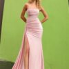 A shimmering stretch satin gown with a plunging V-neckline and rhinestone accents, designed to fit your curves in all the right places. Featuring an open lace up back and leg slit, it’s perfect for a prom night.