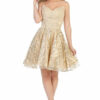 Off-the-shoulder short homecoming dress with embellished sheer boned bodice and leg slit. A sophisticated, elegant piece that adds an alluring edge.