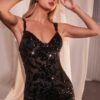 Strapless Printed Iridescent Sequin Fit & Flare Gown with Boned Corset Bodice & Mock Sleeves