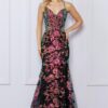 A prom gown with iridescent sequin prints, a V-neck and sheer underarms that add elegance. The fit & flare silhouette flatters your figure and is available in Blue Multi and Royal Multi sizes 2-16.