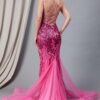 A glitter print gown with a flattering fit and flare design, featuring sheer beaded lace embroidery on the bodice and open lace up back. Available in black, gold, green, lilac, white, and rose gold sizes 2-16. Updated: 10-16.