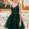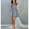 A short satin A-line dress with a ruched V-neck, adjustable spaghetti straps, and side pockets. Available in champagne, rose, and rusted rose. Sizes 2-16 Updated: 10-17