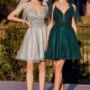 A short full sequin fitted homecoming dress with a V-neck and spaghetti straps, available in Burgundy and Green sizes 2-14. Updated: 10-17
