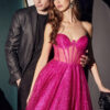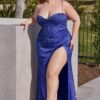 A detailed lace gown with a strappy back, illusion plunging v-neck design, and glitter accents available in periwinkle sizes 2-16. Updated 3-17.